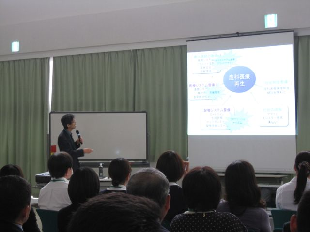 レクチャー、ワークステーションに引き続き、今回の目玉である解説講演「千葉大学病院での産科危機的出血への対応 “コードむらさき” プロジェクト」が、当科の生水教授と田中医師によって行われました。講演部分についてはオープン参加で、近隣の産科施設、消防局、輸血部などからもお集まりいただき、参加者は総勢70名以上に達しました。当科若手医師からなる「劇団むらさき」によるデモンストレーション「“コードむらさき” 発動」も飛び出し、大盛り上がりのうち終了となりました。